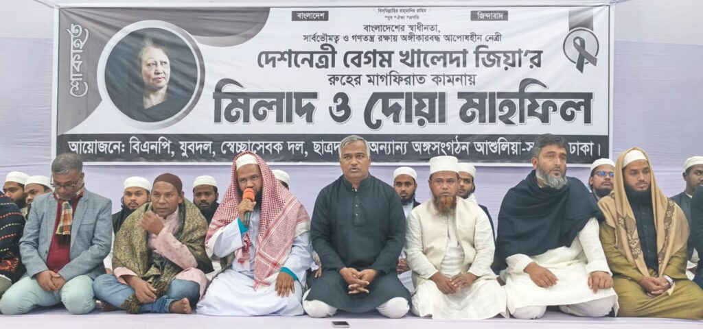 প্রয়াত বিএনপির চেয়ারপারসন ও সাবেক প্রধানমন্ত্রী বেগম খালেদা জিয়ার রুহের মাগফেরাত কামনা করে আশুলিয়ায় বিশেষ দোয়া ও মিলাদ মাহফিল অনুষ্ঠিত হয়েছে।সোমবার (৫ জানুয়ারি) বাদ জোহর আশুলিয়ার ডেন্ডাবর এলাকায় অবস্থিত হাবিব রিসোর্ট এন্ড কনভেনশন হলে ঢাকা জেলা যুবদলের সাধারণ সম্পাদক মোহাম্মদ আইয়ুব খানের উদ্যোগে এই মিলাদ ও দোয়া মাহফিল অনুষ্ঠিত হয়।এ সময় বিএনপি, যুবদল, ছাত্রদল ও স্বেচ্ছাসেবক দলসহ বিএনপি ও এর সহযোগী অঙ্গ সংগঠনের প্রায় কয়েক হাজার নেতা কর্মী এবং স্থানীয় জনগণ উপস্থিত ছিলেন।এছাড়াও ঢাকা জেলা যুবদলের সাধারণ সম্পাদক মোহাম্মদ আইয়ুব খান উপস্থিত সকলের নিকট প্রয়াত শহীদ রাষ্ট্রপতি জিয়াউর রহমান, বেগম খালেদা জিয়া ও আরাফাত রহমান কোকোর রুহের মাগফেরাত কামনা করে সকালের নিকট ফোয়া প্রার্থনা করেন।
